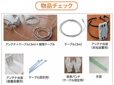 室外アンテナセットにはサッシ枠を通過させられる特別なケーブル(隙間ケーブル)や作業を行うための手袋まで梱包されていました。私は物干し竿のステイにアンテナを設置しました。